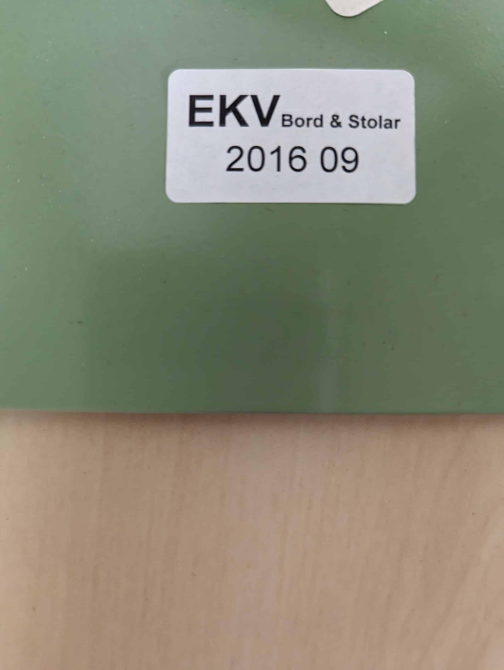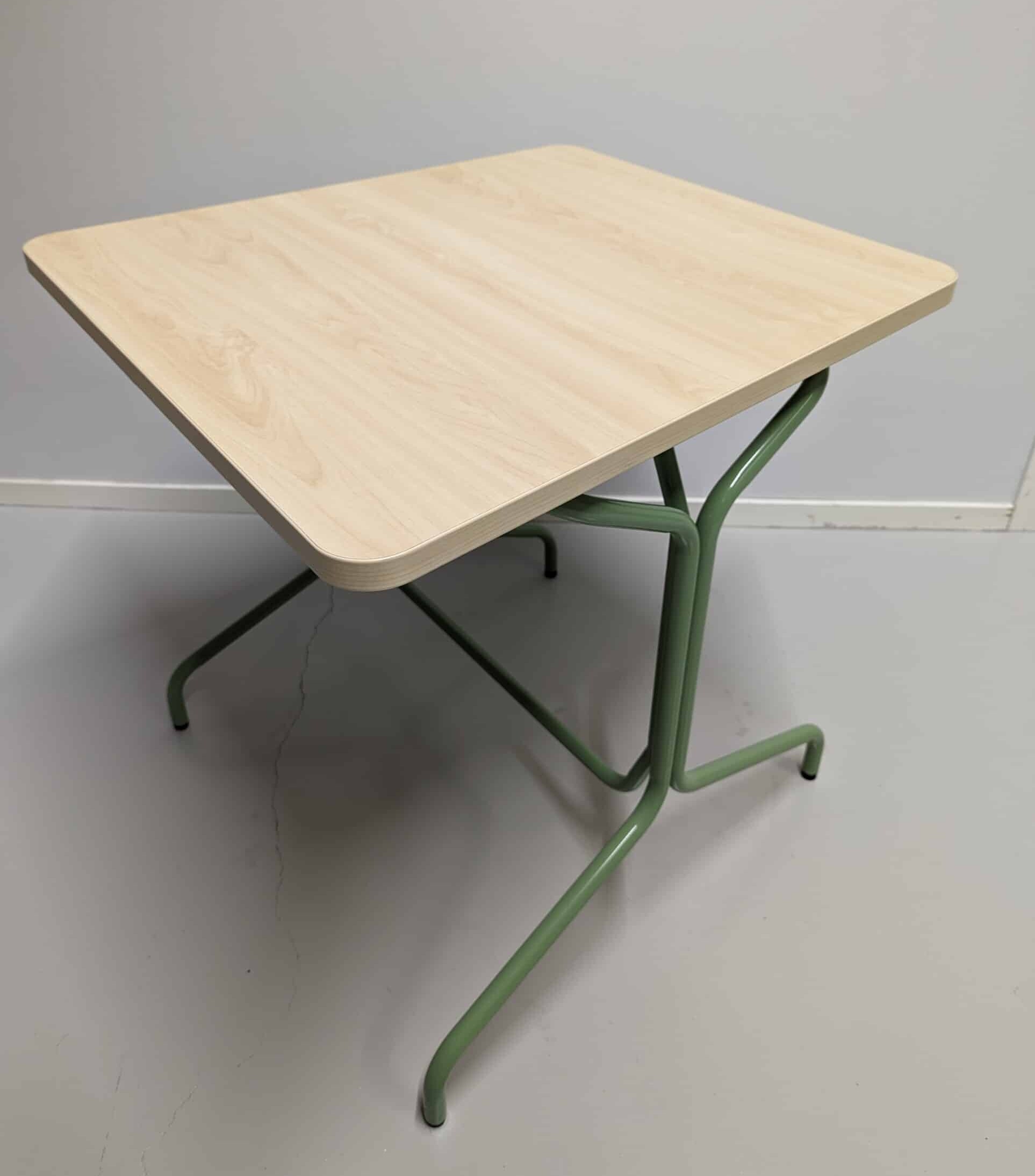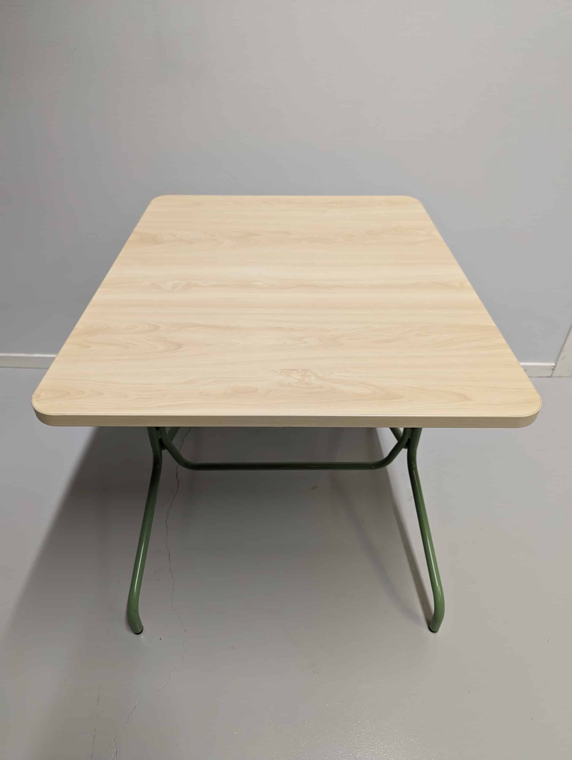 Bordplade i laminat (birk). Understel i metal (grøn).
