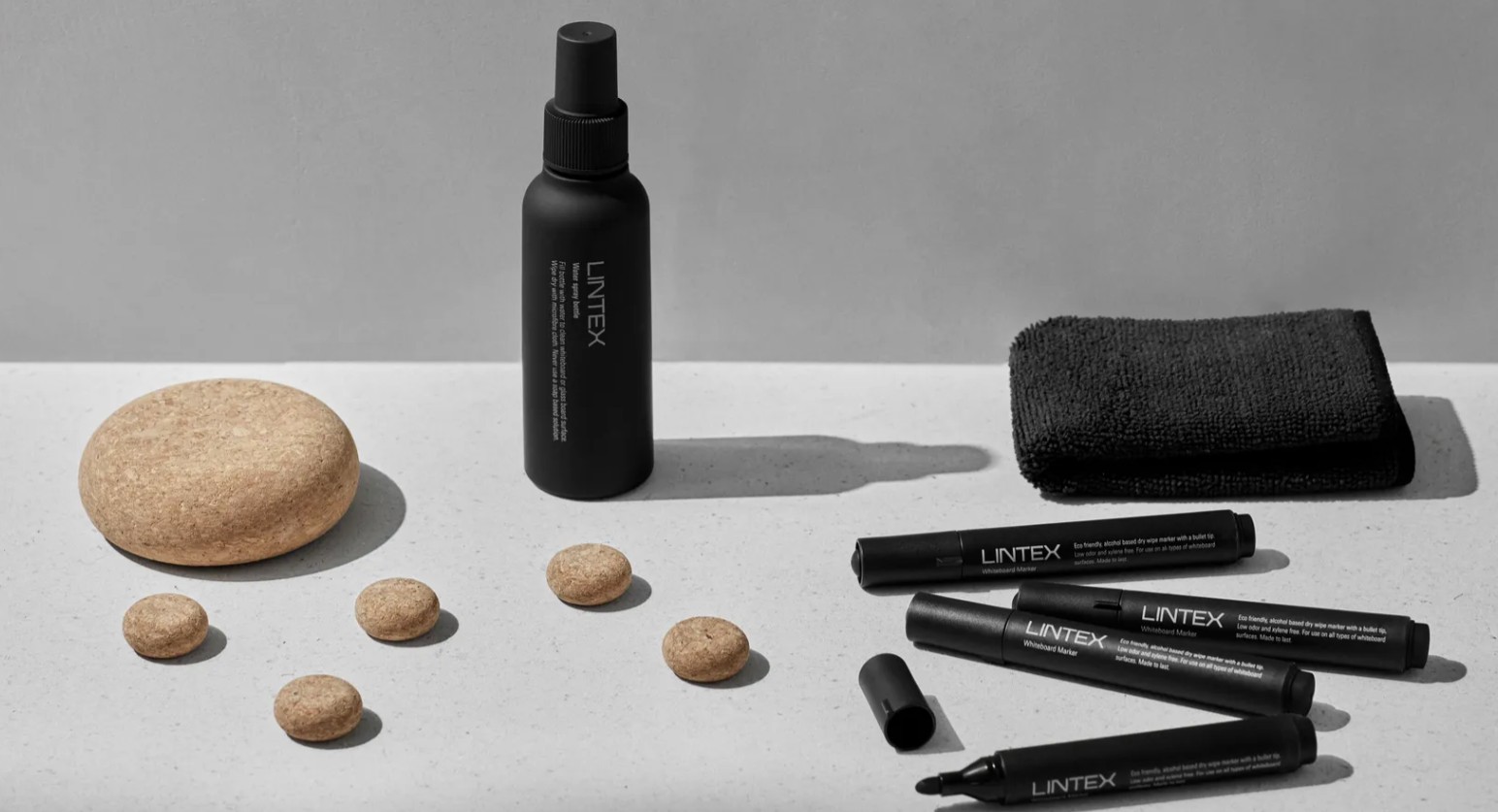 består av 1 avtørker 5 sterke magneter + 4 penner og en sprayflaske