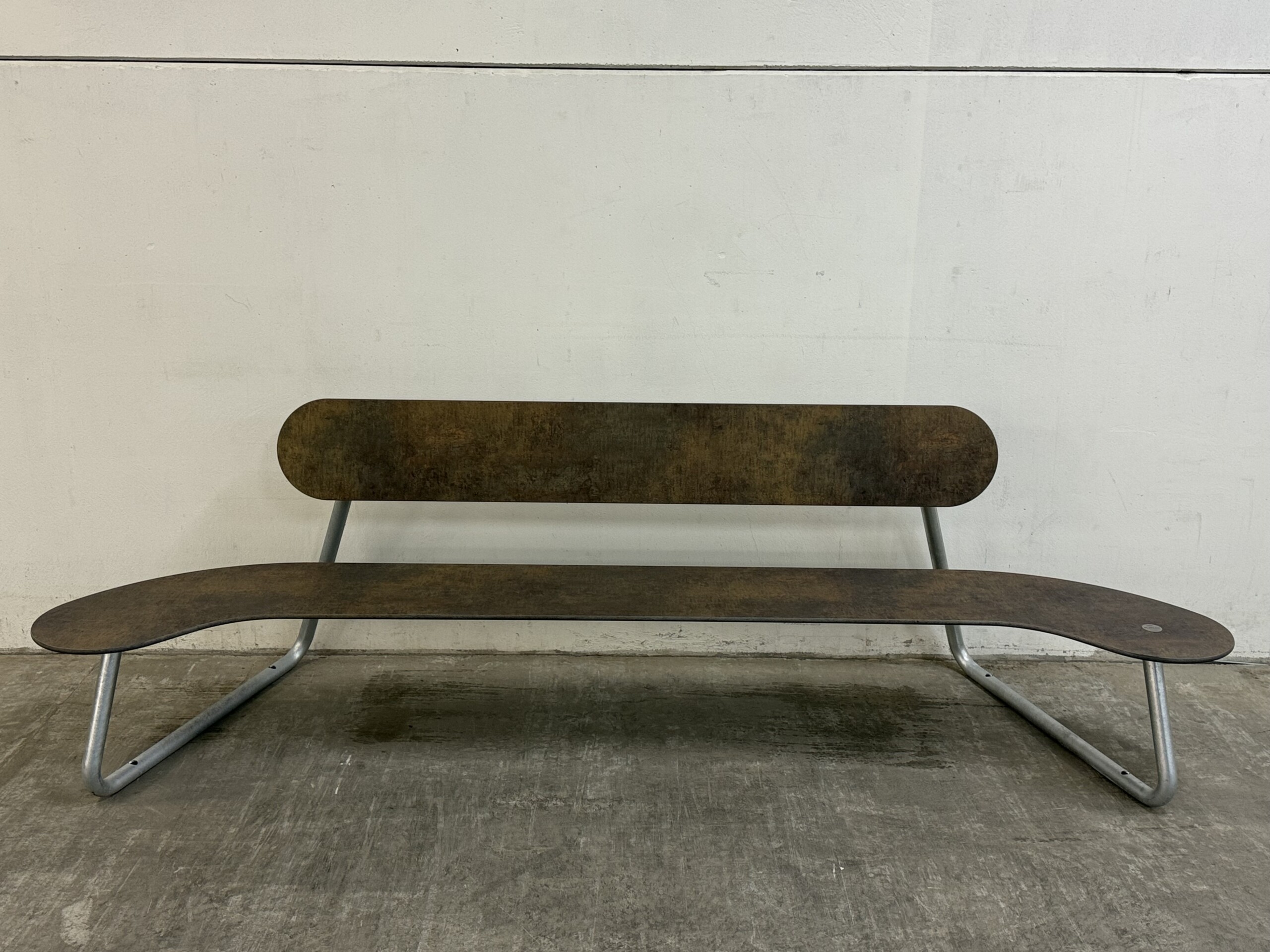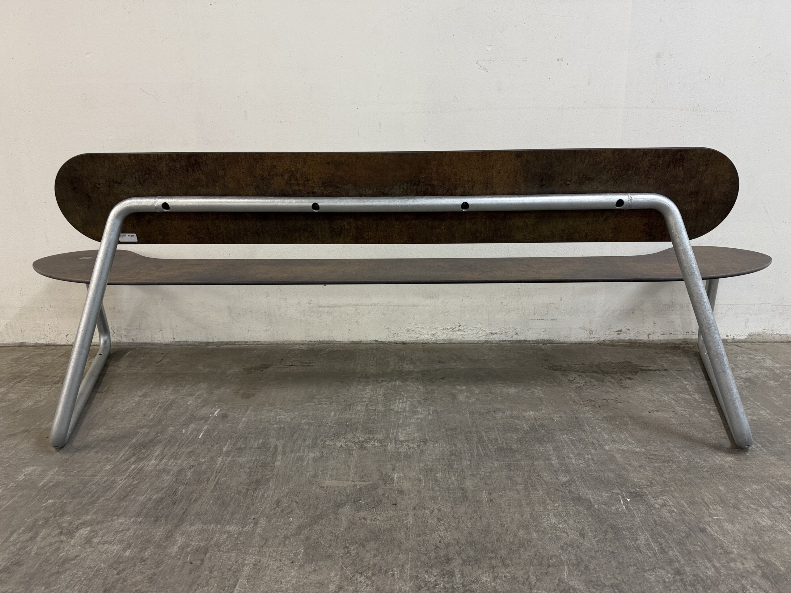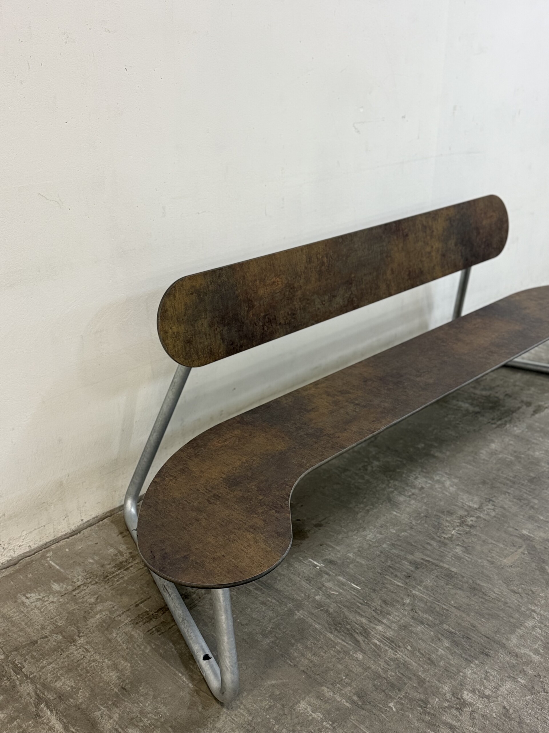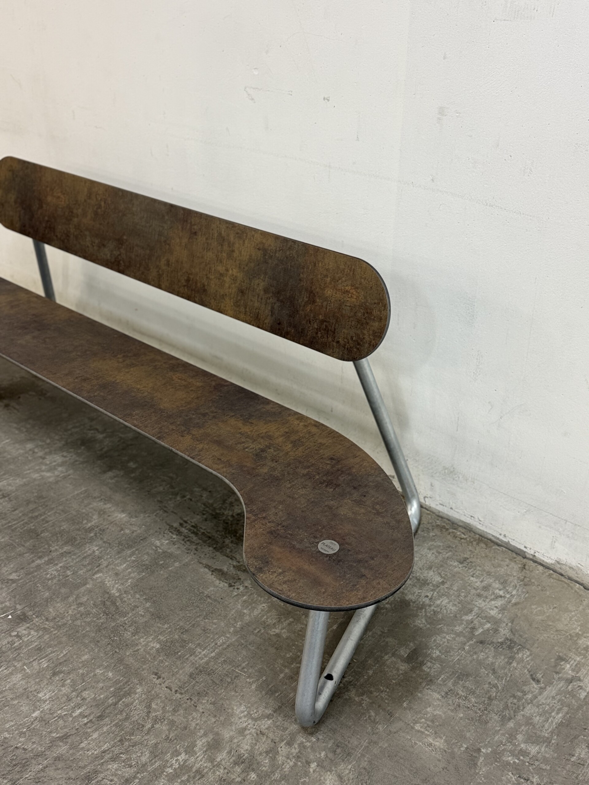 Sæde og ryg i træ (brun). Medestel i metal (aluminium).