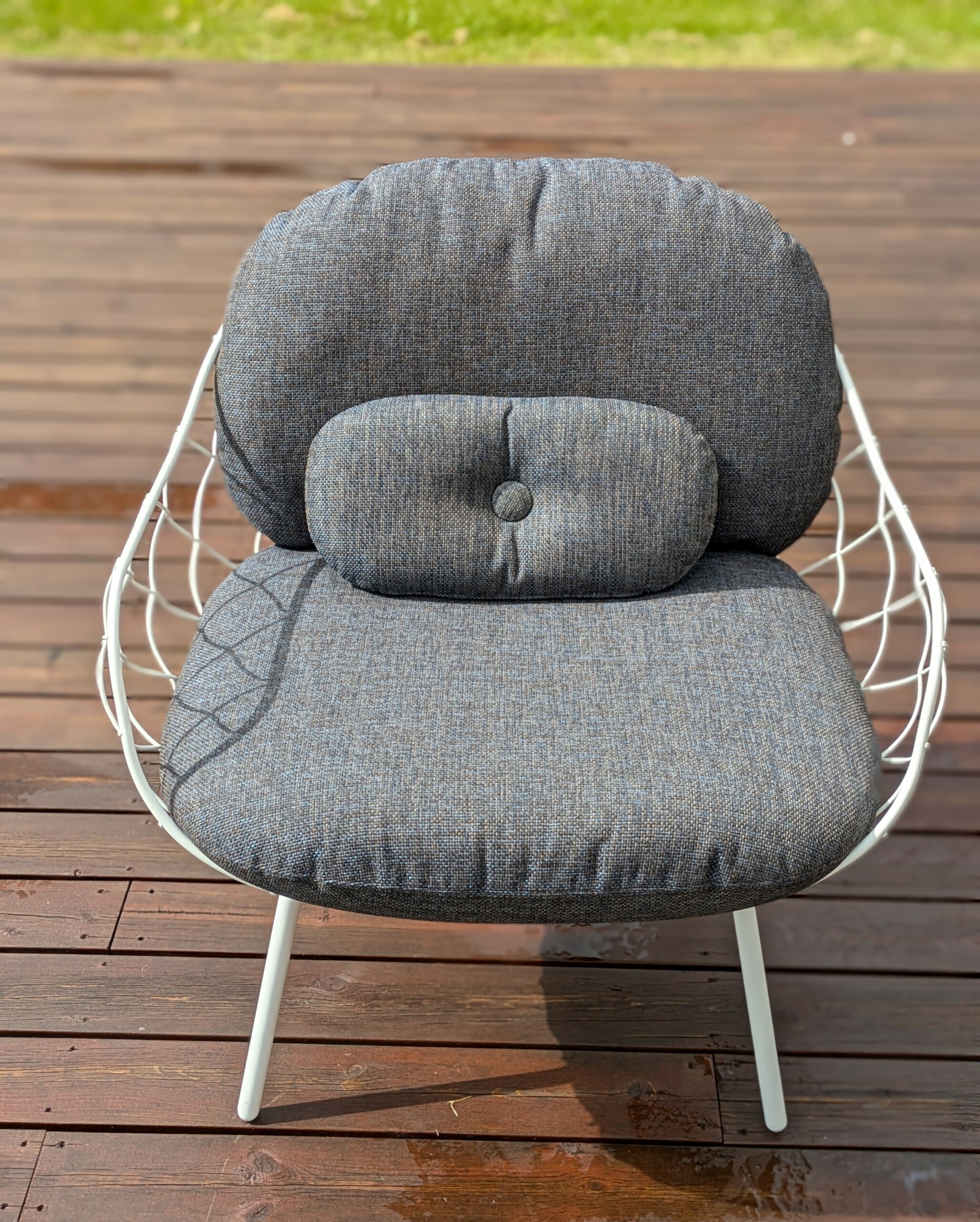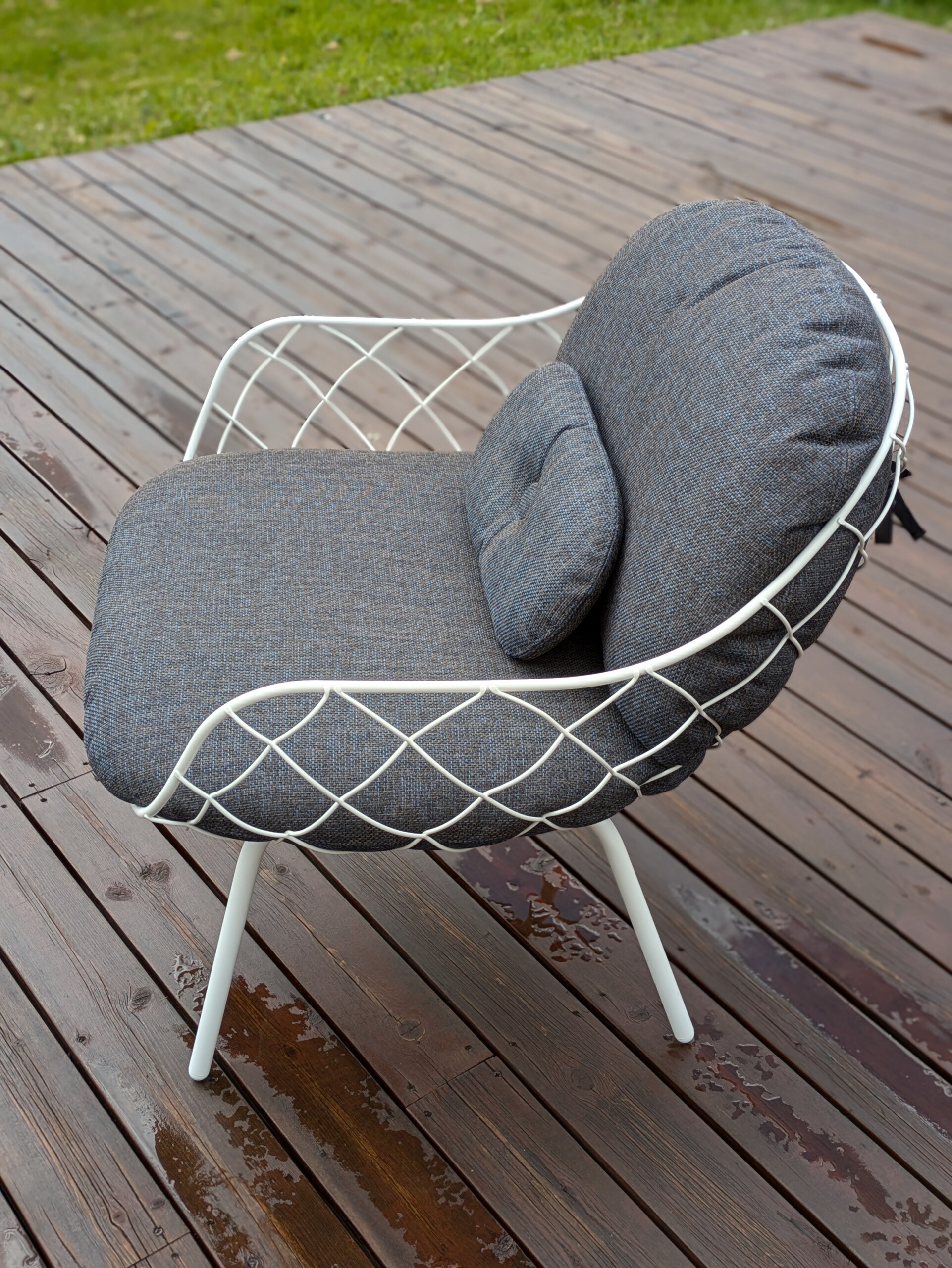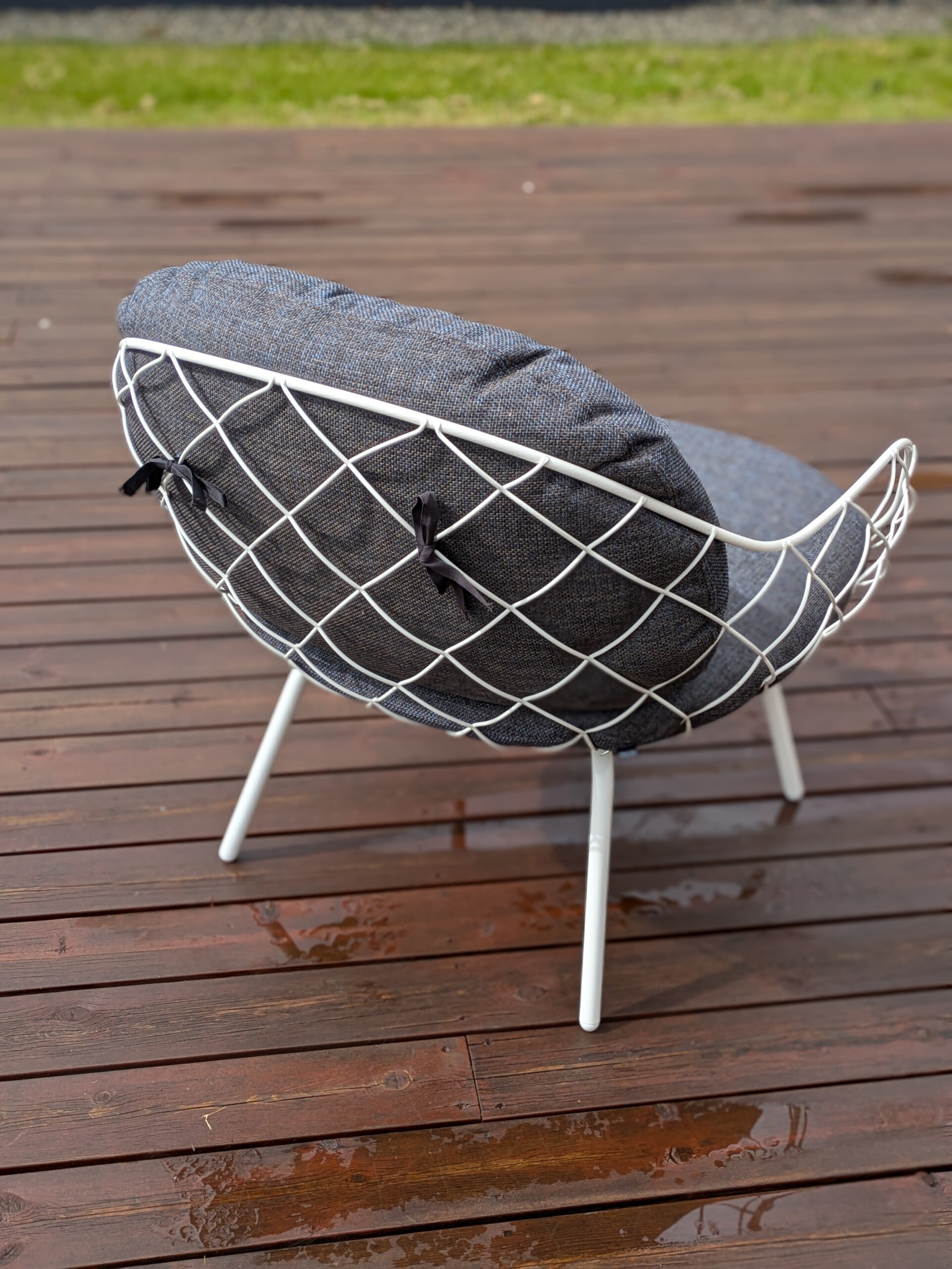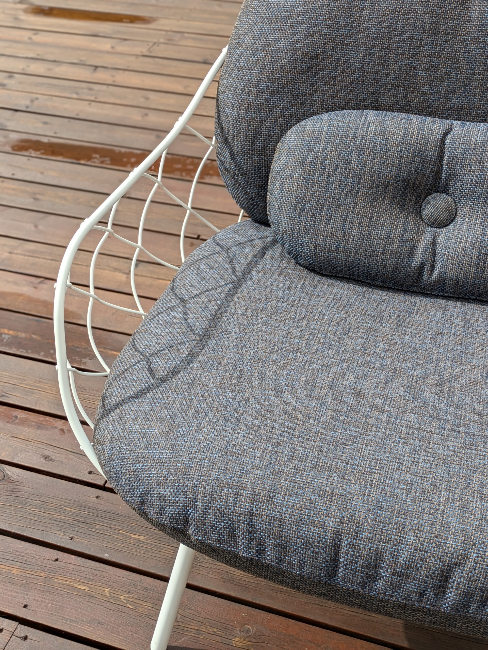 Sæde og ryg i stof (blå). 4-bensstel i metal (hvid).
